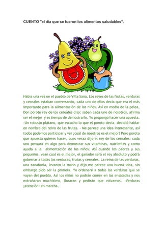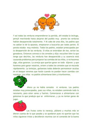 Las frutas, verduras y cereales del pueblo Villa Sana discutían sobre quién era el más importante para la alimentación de los niños. Acordaron una apuesta donde cada grupo demostraría sus beneficios ocultándose. Las verduras y luego los cereales desaparecieron, enfermando a los niños que solo comían golosinas. Las frutas buscaron a los otros grupos y los convencieron de volver, curando a los niños y expulsando a las golosinas del pueblo.