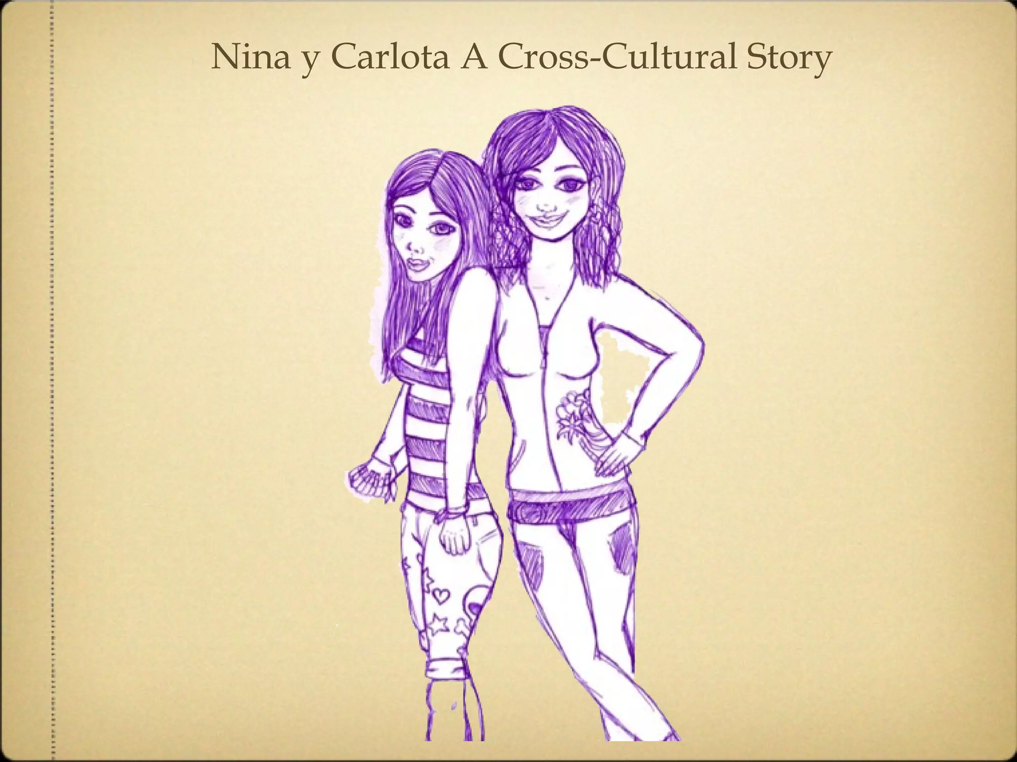 Este documento presenta la historia de dos niñas, Carlota de España y Nina de Alemania, quienes se conocen en un campamento internacional en Inglaterra. Describen sus familias, amigos, gustos y viviendas. Durante el campamento, se hacen amigas y también conocen a un chico llamado Juan. Al final del campamento, deciden visitar Barcelona juntas.
