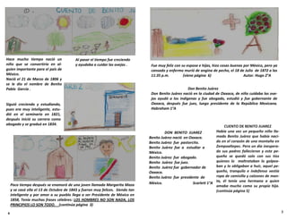 Benito Juárez nació en 1806 en Oaxaca, México. De niño cuidaba ovejas y vivía con su tío, quien lo maltrataba. Un día huyó a la ciudad de Oaxaca para estudiar, donde aprendió español y se graduó como abogado. Más tarde se convirtió en gobernador de Oaxaca y presidente de México, donde promulgó las Leyes de Reforma y luchó por los derechos de los indígenas y campesinos. Falleció en 1872 a los 66 años de edad.