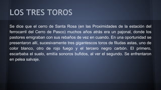 Este documento cuenta dos historias cortas del Cerro de Pasco, Perú. La primera historia trata sobre tres toros gigantes que aparecieron en el cerro de Santa Rosa y luego se convirtieron en yacimientos minerales importantes. La segunda historia es sobre un sastre endeudado que fingió su muerte para evitar pagar sus deudas, pero un zapatero insistió en que le pague lo que le debía.