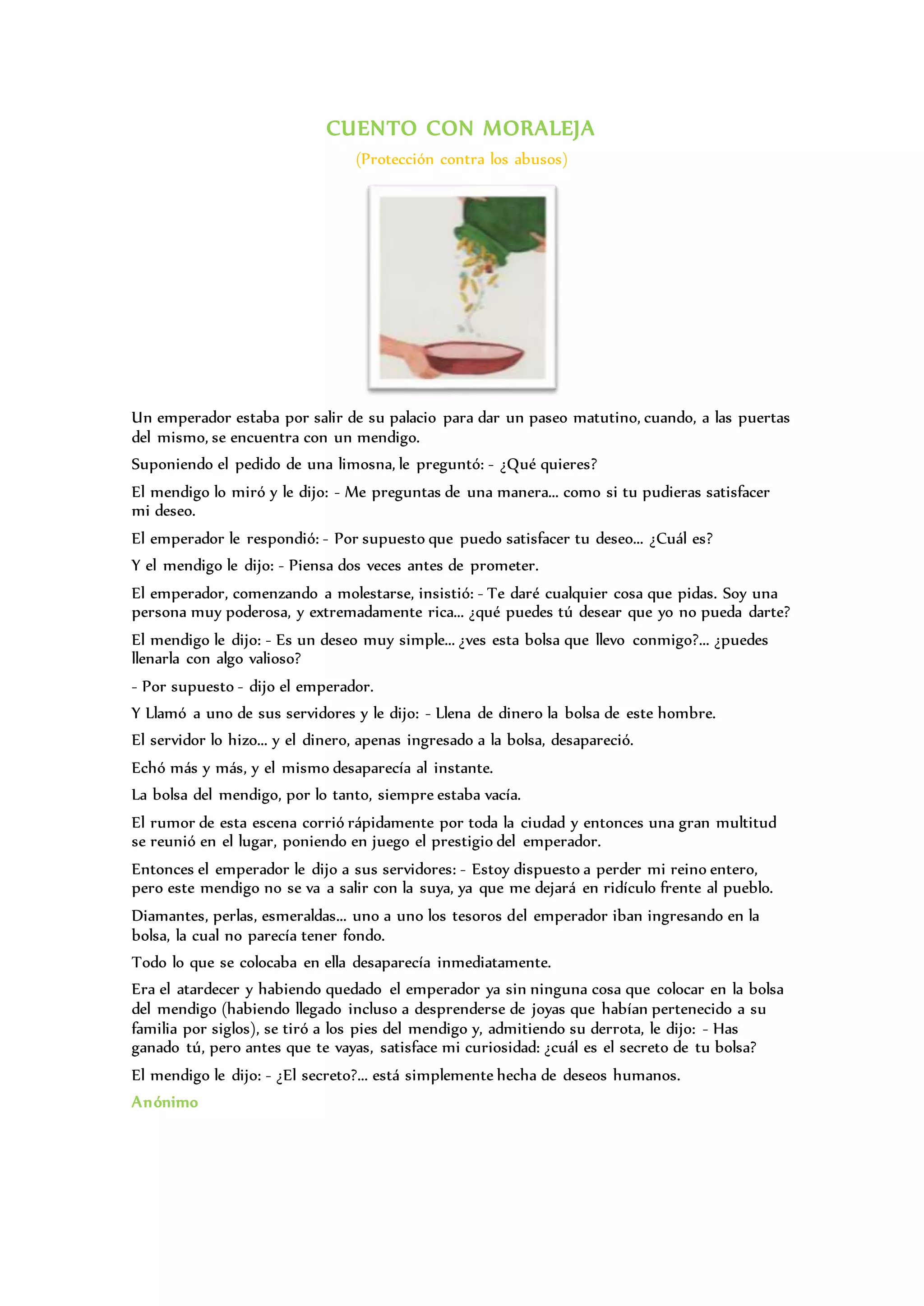 Este cuento con moraleja describe el encuentro entre un emperador y un mendigo. El emperador promete satisfacer cualquier deseo del mendigo. El deseo del mendigo es que el emperador llene su bolsa con algo valioso, pero todo lo que se pone en la bolsa desaparece instantáneamente. A pesar de los esfuerzos del emperador por llenar la bolsa con sus tesoros más valiosos, la bolsa nunca se llena. Finalmente, el mendigo revela que el secreto de la bolsa es