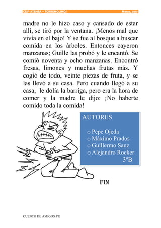 El cuento trata de un niño llamado Guille que no paraba de comer. Su madre le encerró en su cuarto para que dejara de comer, pero Guille se escapó por la ventana y fue al bosque donde comió muchas frutas, incluyendo noventa y ocho manzanas. Cuando regresó a casa con veinte piezas de fruta adicionales, su madre le dijo que no debía haberse comido toda la comida porque ahora le dolía la barriga.