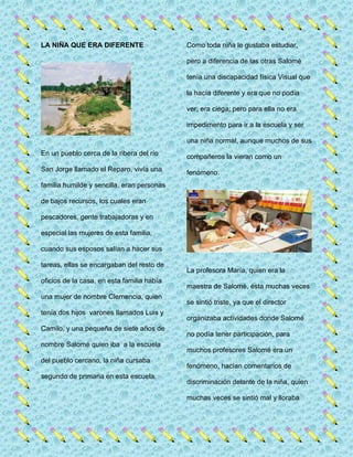 El cuento narra la historia de Salomé, una niña ciega que asiste a la escuela de su pueblo a pesar de la discriminación que sufre de parte de algunos profesores y estudiantes. Un nuevo maestro llamado Rafael organiza una actividad donde todos escriben con los ojos vendados para comprender mejor la perspectiva de Salomé. Esto lleva a los demás a aceptarla y a incluirla en las actividades escolares, mostrando que la discapacidad no debe ser un impedimento para aprender.