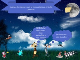El documento describe cómo diferentes animales y personas reaccionan a ver la luna llena en el cielo. Los ratones piensan en el queso, los perros recuerdan a los lobos, los gatos buscan enamorar a sus parejas, y los niños quieren jugar fútbol con la luna. Explica que originalmente la luna rodaba por la tierra pero los animales y niños la molestaban, por lo que decidió subir al cielo donde ahora da vueltas con estrellas a su alrededor.