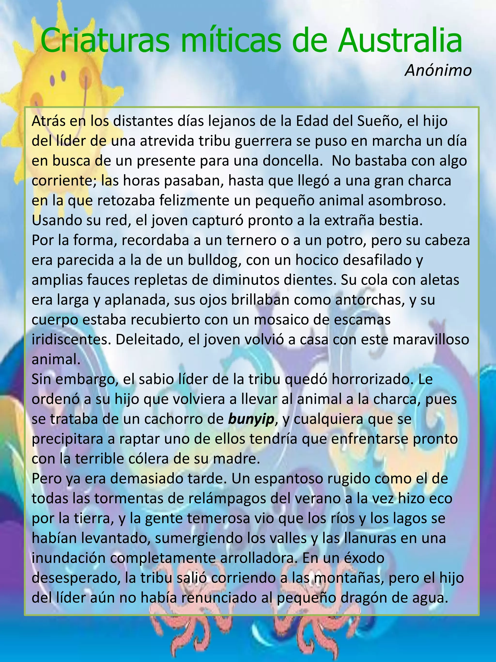 El relato cuenta la historia de un joven guerrero de una tribu australiana que captura un pequeño animal extraño de una charca para regalárselo a una doncella. El sabio líder de la tribu se horroriza al darse cuenta de que se trataba de un cachorro de bunyip y le ordena devolverlo, pero es demasiado tarde. La madre bunyip enfurecida inunda los valles con las aguas y transforma a toda la tribu, incluido el joven, en cisnes negros como castigo por haberse llevado a su cr
