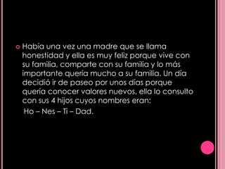 El cuento narra la historia de la madre Honestidad y sus cuatro hijos, quienes deciden ir de viaje para conocer nuevos valores antes de la última Navidad de Honestidad. Durante su aventura, se encuentran con diferentes valores y enfrentan desafíos con antivalores como la hipocresía y el egoísmo. Al final, Honestidad logra reunir a todos los valores en una celebración navideña especial, dejando a su hijo Ho como responsable de la familia.