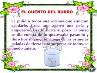 Un campesino tenía un burro que cayó en un pozo. El campesino planeó matar y enterrar al burro, pero cuando comenzó a tirar tierra en el pozo, el burro empezó a sacudirse la tierra y usarla para subir escalones hasta que logró salir del pozo. El campesino aprendió que los problemas de la vida pueden usarse como escalones para salir adelante.