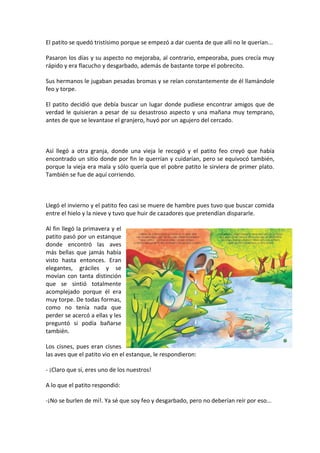 1) Un patito nace feo y desgarbado entre una camada de seis hermosos patitos, por lo que es rechazado por su madre y se burlan de él.
