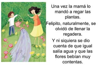 Felipito era distraído y olvidadizo. Su madre le pidió que regara las plantas pero él olvidó llenar la regadera, sin darse cuenta que igual salía un líquido de ella. Cuando su madre revisó, las plantas estaban borrachas porque la regadera estaba llena de vino en lugar de agua. Más tarde, la regadera mágicamente se llenaba de leche, tinta, caldo de gallina u otros líquidos, pero nunca de agua.