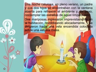 Un padre y sus dos hijos observan dos mariposas que entran por la ventana a su habitación. Una de las mariposas se acerca demasiado a una vela encendida y sus alas se queman, matándola. La otra mariposa continúa volando cerca de la llama, por lo que el padre la atrapa en un vaso para salvarle la vida. El padre usa esta historia para enseñar a sus hijos sobre los peligros de arriesgarse sin razón y la importancia de la disciplina.