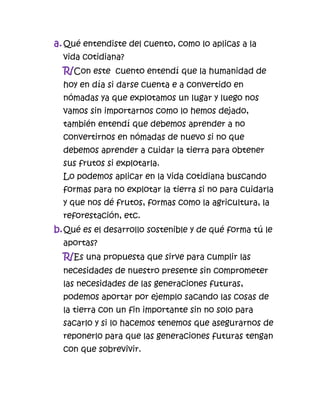 Este documento presenta un resumen de 3 oraciones o menos del cuento "Los nómadas modernos" por María Camila Restrepo Gómez. El cuento explora cómo la humanidad ha explotado los recursos naturales sin preocuparse por el impacto a largo plazo, convirtiéndose en "nómadas modernos". El resumen enfatiza la necesidad de aprender a cuidar la tierra de manera sostenible para que pueda seguir proporcionando recursos a las generaciones futuras.
