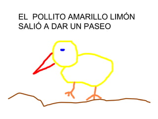 Un pollito amarillo limón salió a dar un paseo pero empezó a llover, así que se metió en una cueva y se puso triste. Cuando salió el sol de nuevo, se puso contento y fue a buscar a su mamá.