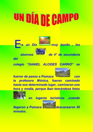 Los estudiantes de cuarto año de secundaria visitaron Pomaca con su profesora Mónica, donde pasaron el día caminando, tomando fotos, pescando, cocinando y jugando deportes como fútbol y vóley. Se quedaron en la casa de la tía de uno de los estudiantes, quien les ofreció comida y un lugar para dormir. Antes de irse al día siguiente, ayudaron a la anfitriona con la leche y recibieron una ovejita como regalo.