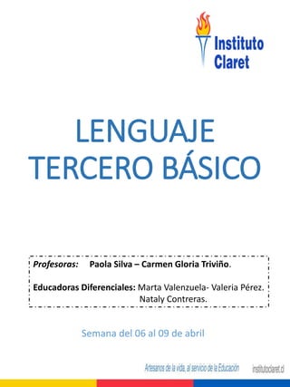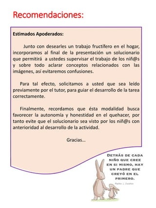 Este documento presenta las recomendaciones para una tarea de lenguaje de tercero básico durante la semana del 6 al 9 de abril. Contiene instrucciones para los apoderados sobre cómo supervisar la tarea de los estudiantes y aclarar conceptos, así como un solucionario para revisar las respuestas. También incluye actividades sobre cuentos, lectura, sílabas y acentos para que los niños completen en sus cuadernos.