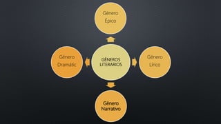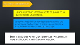 El documento resume los principales géneros literarios, enfocándose en el género narrativo. Explica que una narración cuenta una historia a través de personajes y sucesos, y puede ser de ficción o no ficción. También describe los subgéneros del cuento y la novela, la estructura típica de una narración, y los elementos clave como el narrador, el espacio/tiempo, los personajes y las acciones.