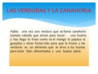 Este documento contiene varios cuentos cortos sobre frutas, verduras y niños. En uno, una manzana y una cebolla se vuelven amigas a pesar de sus diferencias. Otro habla de una niña que cuida la naturaleza en una aldea frutal. Un tercer cuento trata sobre unos piratas hambrientos que encuentran verduras en la orilla del mar.