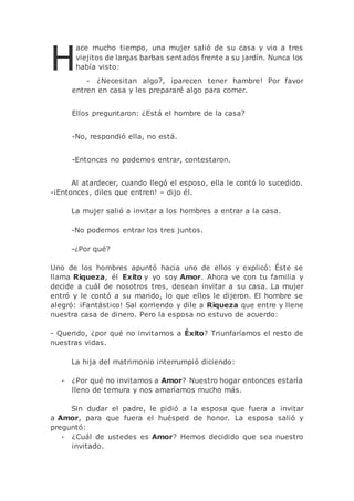 Este cuento relata la historia de una familia que recibe la visita de tres ancianos que representan la Riqueza, el Éxito y el Amor. La familia debe decidir a cuál de los tres invitar a su hogar. Tras discutirlo, deciden invitar al Amor, y los otros dos ancianos les dicen que donde haya Amor también habrá Riqueza y Éxito.