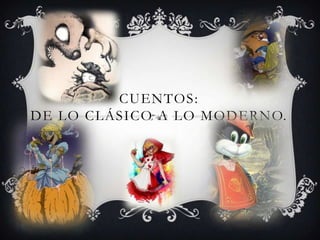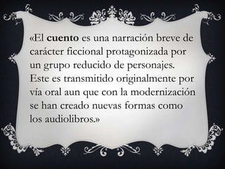 Este documento resume la evolución de los cuentos, desde sus orígenes orales hasta formas más modernas. Comenzó como anécdotas transmitidas oralmente y los primeros cuentos conocidos provienen de la cultura oriental. Autores como los hermanos Grimm compilaron cuentos anónimos en libros. Posteriormente, escritores como Hans Christian Andersen y Lewis Carroll popularizaron los cuentos infantiles, mientras que Edgar Allan Poe revolucionó el género con la introducción del terror. Los cuentos continuaron evolucionando con nuevos escritores