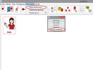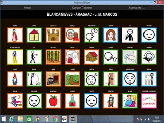 Este documento describe cómo los cuentos pueden utilizarse como una herramienta para desarrollar las habilidades comunicativas y de alfabetización en niños con dificultades graves del lenguaje o discapacidades. Se presenta un método que incluye escuchar y comprender un cuento proyectado mientras se seleccionan pictogramas para formar oraciones, realizar actividades relacionadas y cantar una canción al final. El objetivo es mejorar diversas competencias como la comunicación, matemáticas, sociales y más.
