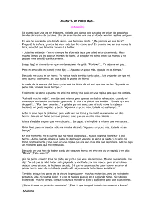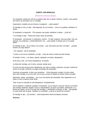 El documento presenta 5 cuentos cortos con moralejas. El primer cuento trata sobre un emperador que promete cumplir cualquier deseo de un mendigo, pero no puede llenar su bolsa sin fondo. El segundo habla sobre una taza que pasa por un proceso de moldeado y horneado para convertirse en algo hermoso. El tercer cuento presenta a un pintor que pinta un paisaje en lugar de traer imágenes porque la libertad no se puede encerrar. El cuarto cuenta la historia de una maestra que juzga err