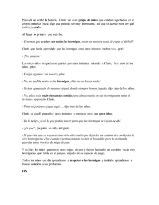 El documento cuenta la historia de Clarín, un niño curioso que le hacía muchas preguntas a sus padres. Un día en el parque se asustó de una hormiga pero aprendió que eran inofensivas. Vio a otros niños que querían matar hormigas porque se habían apropiado de su espacio de juego, pero Clarín les enseñó a dejarles un camino de migas para que se fueran a otro hormiguero, resolviendo el problema de forma pacífica. Los niños aprendieron a respetar a las hormigas.