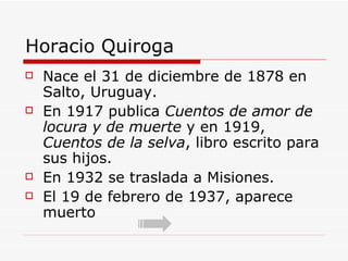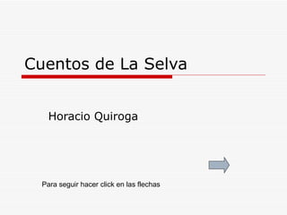 Este documento presenta resúmenes de 3 cuentos de Horacio Quiroga. El primero trata sobre un hombre que se muda al campo para curarse y es ayudado por una tortuga gigante. El segundo habla sobre unos flamencos que usan medias de colores prestadas y son picados por víboras. El tercero narra la historia de un loro pelado que es atacado por un tigre.