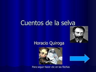 Este documento presenta una breve biografía de Horacio Quiroga, escritor uruguayo, y resume los cuentos contenidos en su libro "Cuentos de la selva". Incluye detalles sobre la vida y obra de Quiroga, así como sinopsis de los cuentos "La tortuga gigante", "Las medias de los flamencos", "El loro pelado" y "La guerra de los yacarés".