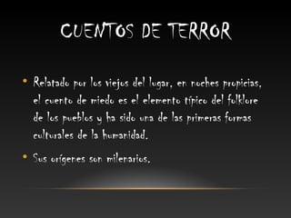 Este documento describe los elementos clave del género de cuentos de terror. Explica que los cuentos de terror surgen de leyendas y supersticiones para crear sensaciones de miedo y amenaza. Describe los operadores comunes como la incertidumbre y la indefensión, así como agentes conocidos y desconocidos que generan terror. Explora los personajes, el clima y posibles finales en los cuentos de terror.