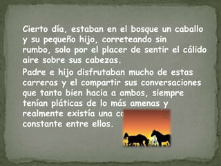 El padre y su hijo caballo disfrutaban corriendo juntos en el bosque. Un día, el hijo tropezó y cayó, lastimándose una pata. Aunque el hijo pensó que no podría levantarse, el padre lo animó diciendo que los animales a veces caen pero siempre se pueden levantar con voluntad y amor. El hijo se levantó y siguió corriendo con su padre.