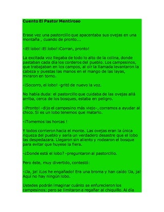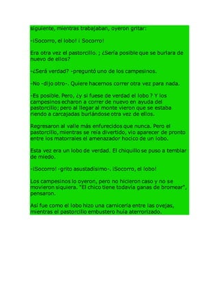 El pastorcillo mentiroso gritaba falsamente "¡El lobo!" dos veces para burlarse de los campesinos, haciéndolos correr innecesariamente. La tercera vez que gritó, realmente había un lobo, pero los campesinos ya no le creyeron y no acudieron a ayudarlo. Como resultado, el lobo mató a muchas ovejas mientras el pastorcillo huía asustado.
