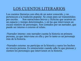 El documento resume los principales componentes de los cuentos literarios. Explica que son obras creadas por autores conocidos para transmitirse por escrito. Se componen de introducción, nudo y desenlace, y existen diversos subgéneros como policiales, de ciencia ficción, fantásticos y de hadas. Además, presenta a destacados escritores de cuentos como Edgar Allan Poe, Jorge Luis Borges, Augusto Monterroso y Eduardo Galeano, resumiendo uno de sus cuentos más famosos. Por último, anal
