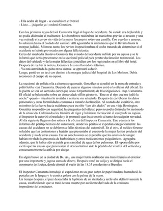 El documento presenta la trama de una historia policial que involucra el accidente automovilístico y muerte de la esposa de un empresario. El inspector Camaratta investiga el caso pero encuentra evidencia que sugiere que el accidente fue planeado para simular un homicidio. El empresario había estado teniendo una aventura con otro hombre.