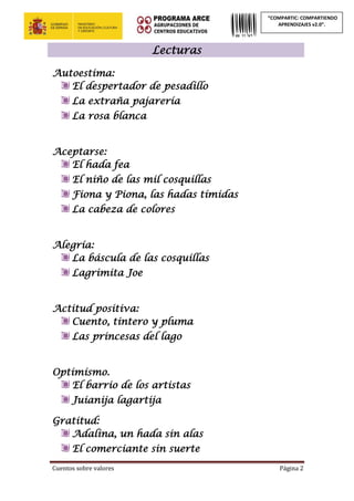 Este documento contiene resúmenes de cuentos sobre valores en 3 oraciones o menos. Incluye cuentos sobre autoestima, aceptarse, alegría, actitud positiva, optimismo, gratitud y fortaleza. Cada cuento va seguido de preguntas y actividades para trabajar el valor en cuestión. El objetivo es utilizar estas lecturas para enseñar valores a los niños de manera entretenida.