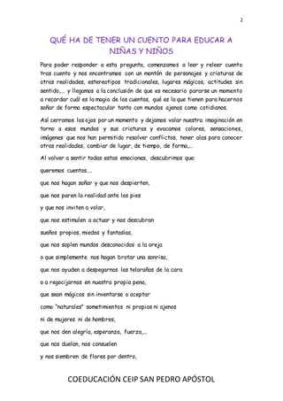 El documento aborda la importancia de los cuentos en la educación de niñas y niños, destacando la necesidad de que estos relatos promuevan la libertad, el respeto y la igualdad, evitando estereotipos de género y jerarquías sociales. Propone diversas actividades didácticas que incorporan dimensiones individuales, relacionales y sociales, animando a los estudiantes a reflexionar y transformar narrativas tradicionales. Además, se enfatiza la magia de los cuentos como herramienta para desarrollar la creatividad y favorecer un ambiente de aprendizaje inclusivo.