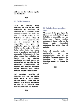 El documento contiene 5 cuentos cortos de Augusto Monterroso. El primer cuento, "El Eclipse", trata sobre un fraile llamado Bartolomé Arrazola que es capturado por indígenas en la selva de Guatemala y amenazado de sacrificio, pero logra engañarlos citando un eclipse solar que ocurriría ese día. Los otros cuentos son "El Grillo Maestro", sobre un grillo maestro que enseña a otros grillos, "El Caballo Imaginando a Dios" sobre las ideas de un caballo sobre Dios