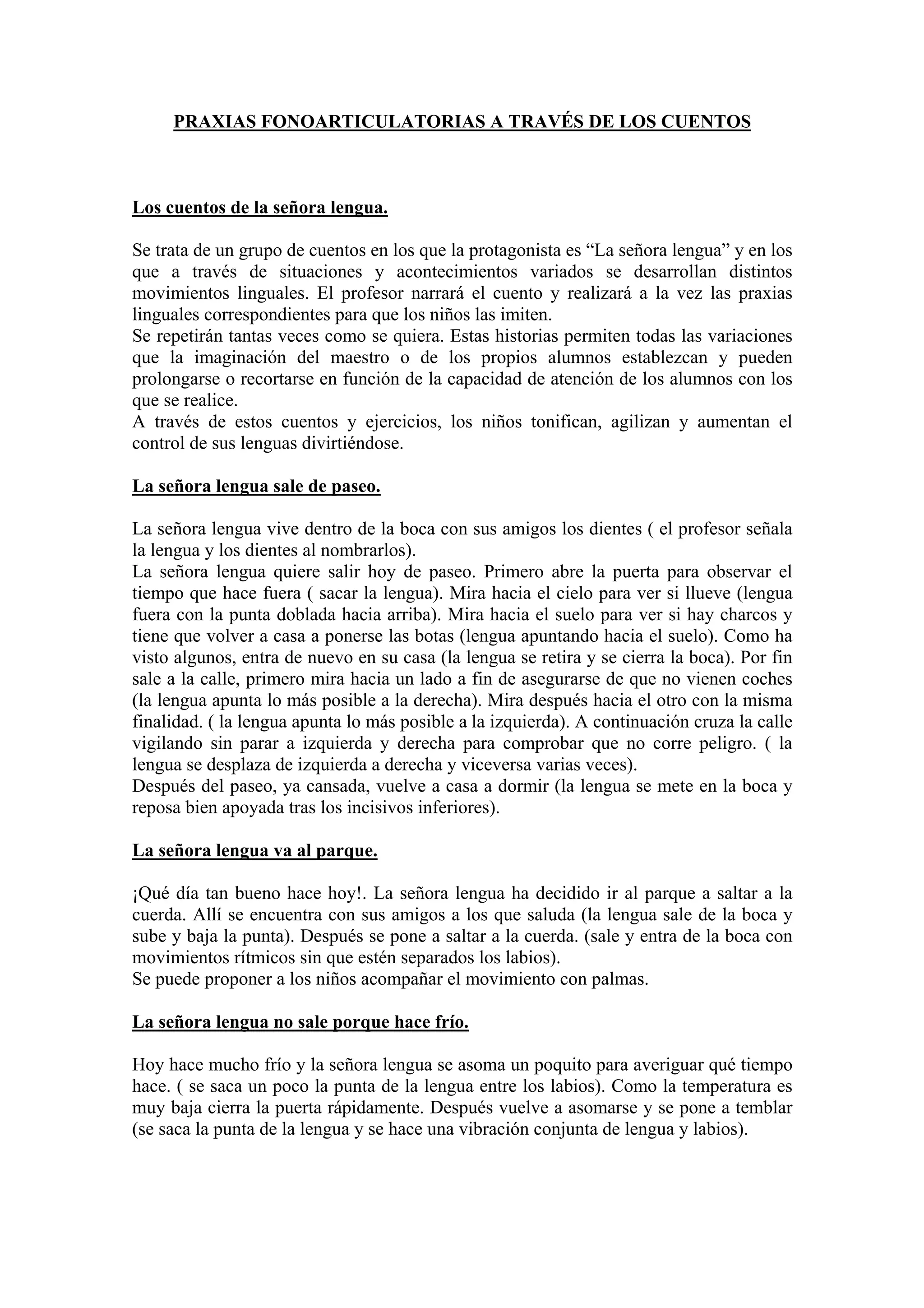 Este documento presenta varios cuentos enfocados en desarrollar habilidades motoras orales a través de la "Señora Lengua". Cada cuento describe acciones realizadas con la lengua que los niños imitan, como sacar la lengua, moverla de un lado a otro, y doblarla. El objetivo es que los niños se diviertan practicando los movimientos de la lengua para fortalecerla y mejorar su control.