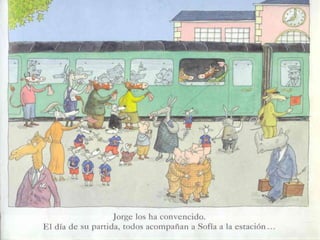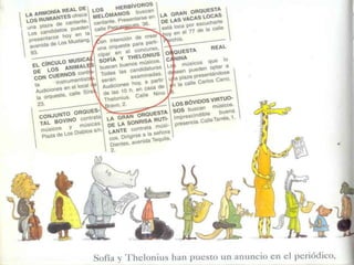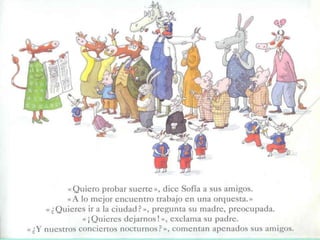 El documento presenta un resumen del cuento "Sofía, la vaca que amaba la música". Se realizan preguntas sobre los detalles del cuento, incluyendo que a Sofía le gusta cantar, buscó trabajo en la ciudad, y formó una orquesta con sus amigos para tocar música.