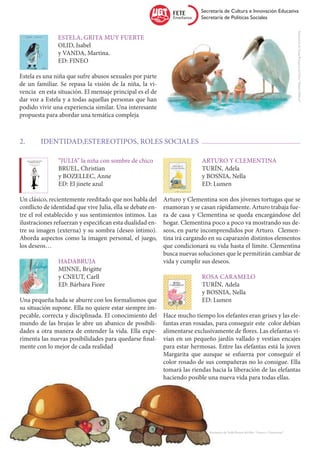 Este documento presenta una selección de cuentos infantiles dirigidos a combatir la violencia de género en escuelas. Los cuentos están estructurados en cinco ejes: 1) acoso y violencia, 2) identidad, estereotipos y roles sociales, 3) gestión emocional, 4) convivencia y 5) cuento popular. Se resumen brevemente varios cuentos que abordan estos temas de una manera positiva y que pueden servir como catalizadores para conversaciones sobre estas problemáticas sociales importantes.