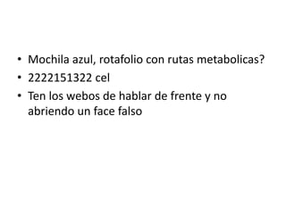 Una persona busca una mochila azul y un portafolio con rutas metabólicas, y proporciona un número de celular. También pide a alguien que hable directamente en lugar de usar una cuenta falsa en Facebook.
