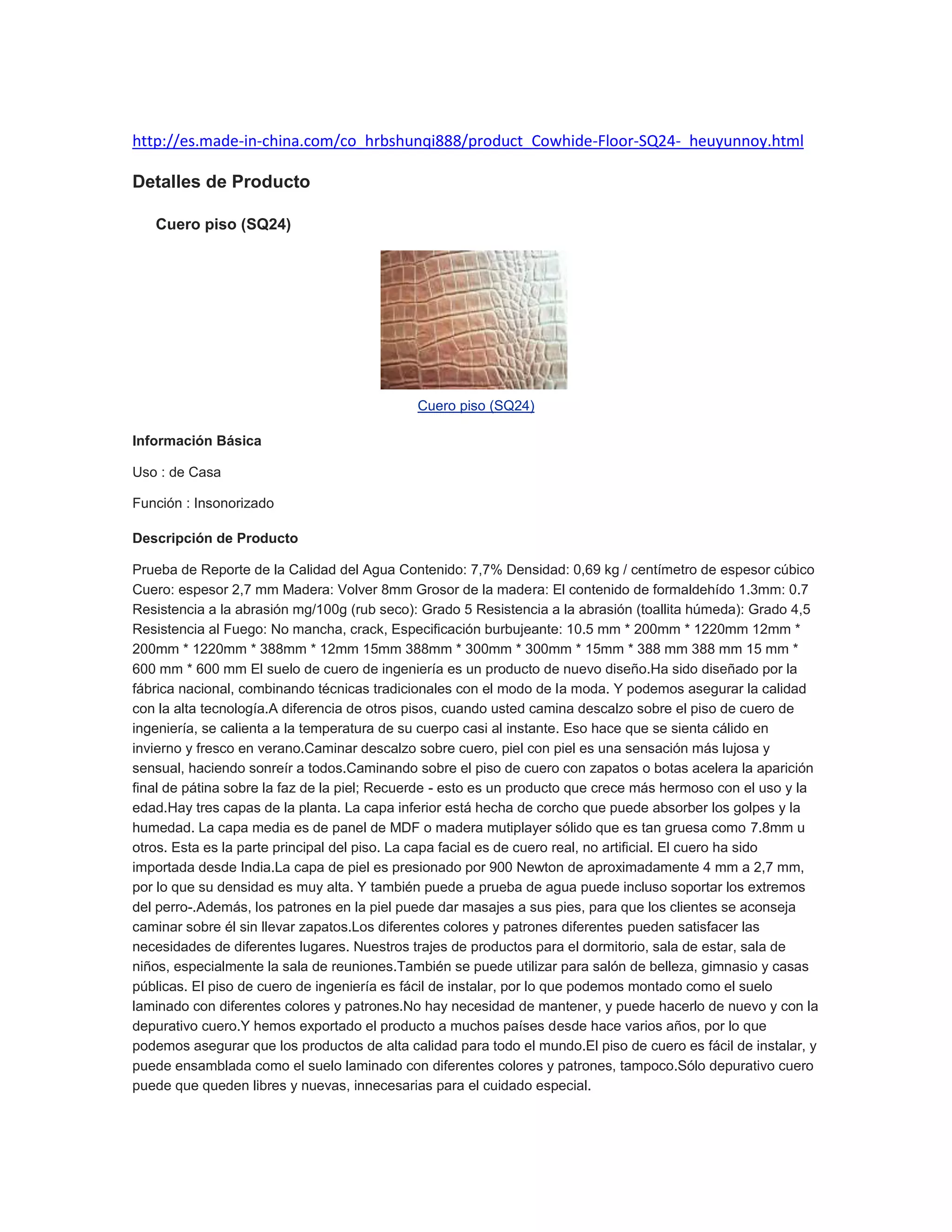 El documento describe un piso de cuero llamado SQ24. Tiene tres capas: la inferior de corcho, la intermedia de madera y la superior de cuero real importado de la India. El cuero tiene un espesor de 2,7 mm y alta densidad. El piso proporciona calor en invierno y frescor en verano al caminar descalzo sobre él. Se puede instalar fácilmente como laminado en diferentes colores y patrones.