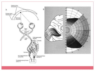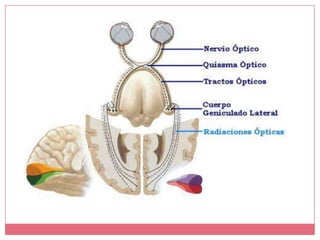 El cuerpo geniculado lateral procesa la información visual de forma paralela y regula el flujo de señales a la corteza visual. Está organizado en capas que representan cada hemicampo visual contralateral y contienen mapas retinotópicos. Cada capa recibe aferencias de un solo ojo y tipo de célula ganglionar e incluye células repetidoras que envían axones a la corteza visual y células interneuronas inhibitorias.