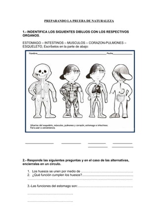 Este documento presenta preguntas sobre los sistemas y órganos del cuerpo humano, incluyendo el sistema digestivo, circulatorio, respiratorio y esquelético. Contiene preguntas de selección múltiple y verdadero/falso sobre la función de órganos como el estómago, intestinos, corazón, pulmones, huesos y músculos. También pregunta sobre una alimentación y ejercicio saludables.