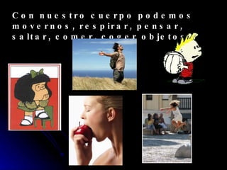 El cuerpo humano está compuesto de una cabeza, tronco y extremidades que permiten funciones como moverse, respirar y pensar. Internamente contiene huesos que brindan estructura, músculos que posibilitan el movimiento y articulaciones entre los huesos que permiten la flexibilidad.