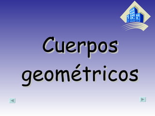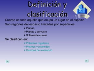 Los cuerpos geométricos se clasifican en poliedros regulares, prismas, pirámides y cuerpos de revolución. Los poliedros regulares incluyen el tetraedro, cubo, octaedro, dodecaedro e icosaedro. Los prismas tienen dos bases paralelas y caras laterales rectangulares, mientras que las pirámides tienen una base y caras laterales triangulares. Los cuerpos de revolución, como el cilindro, cono y esfera, se forman girando una figura plana