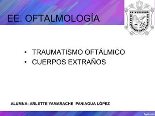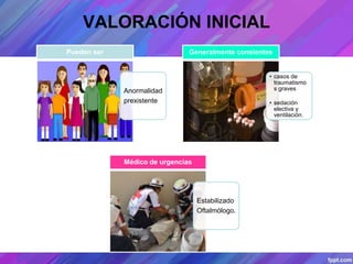Este documento resume los principales aspectos del examen y tratamiento de urgencia de lesiones oftálmicas como traumatismos, cuerpos extraños y quemaduras. Describe la evaluación inicial del paciente, incluidos los antecedentes, examen físico y posibles hallazgos. Explica el manejo de diferentes tipos de lesiones como químicas, mecánicas, térmicas y electromagnéticas. Resalta la importancia de estabilizar al paciente, tratar las lesiones de manera adecuada y realizar exámenes adic