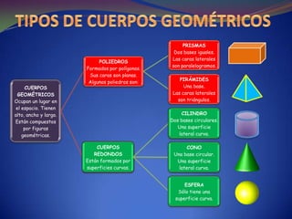 Este documento describe diferentes cuerpos geométricos como prismas, pirámides, cilindros, conos y esferas. Explica que los poliedros están formados por polígonos planos y tienen vértices, aristas y caras. Los prismas y pirámides tienen bases y caras laterales planas, mientras que los cuerpos redondos como cilindros y conos tienen superficies curvas. También describe poliedros regulares con caras polígonos iguales.