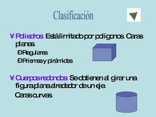 Este documento describe diferentes tipos de cuerpos geométricos tridimensionales. Explica que los poliedros tienen caras planas y están limitados por polígonos, mientras que los cuerpos redondos tienen caras curvas y se obtienen al girar una figura plana alrededor de un eje. Luego describe varios poliedros regulares como el tetraedro, cubo, octaedro y dodecaedro. También explica los diferentes elementos de los prismas, pirámides, cilindros, conos y esferas.