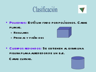 Este documento describe las características de diferentes tipos de poliedros y cuerpos geométricos tridimensionales. Explica que los poliedros tienen caras planas y pueden ser regulares como el cubo o irregulares. Los prismas y pirámides son poliedros con caras planas, mientras que los cuerpos de revolución como el cono, cilindro y esfera tienen caras curvas obtenidas al girar una figura plana alrededor de un eje. También clasifica y define elementos geométricos clave de estos