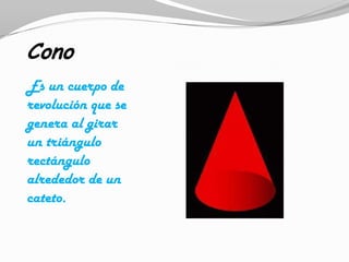 Este documento describe los cuerpos geométricos redondos principales: el cono, el cilindro y la esfera. Se generan todos por rotación: el cono por rotación de un triángulo rectángulo, el cilindro por rotación de un rectángulo, y la esfera por rotación de un semicírculo. Cada uno tiene elementos característicos como la base, el radio y la altura.