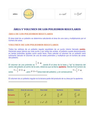 El documento proporciona información sobre diferentes cuerpos geométricos, incluyendo sus nombres, dibujos, áreas y volúmenes. Explica los poliedros regulares, sus características y los cinco poliedros regulares convexos. También cubre otros temas como los poliedros conjugados, los sólidos arquimedianos y los poliedros estrellados.